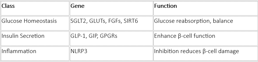 ● T2DM: T2DM is driven by insulin resistance and progressive β-cell dysfunction. Gene therapy here targets pathways involved in insulin sensitivity, secretion, and inflammation. Several specific genes have been identified as promising targets: